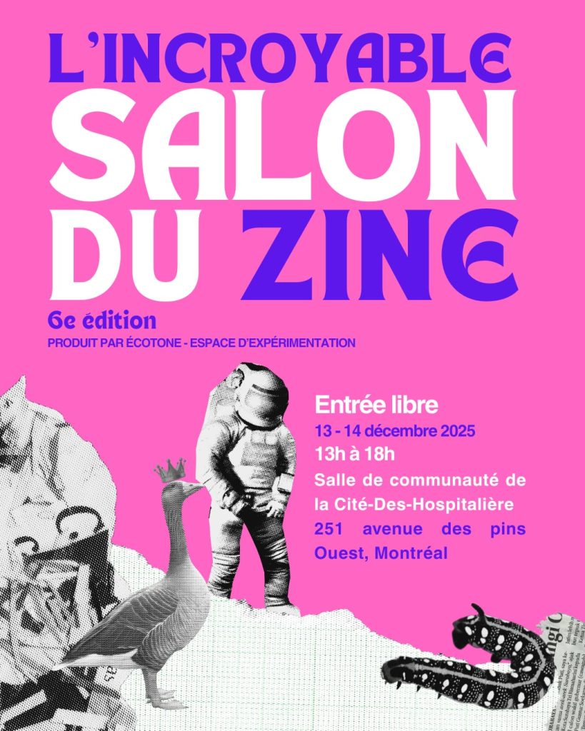 Zine zine zine, le 13-14 décembre de 13h à 18h, à l’Incroyable Salon du Zine! À la Cité des hospitalières, 251 avenue des Pins à Montréal, entrée gratuite.